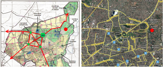 Map 1. The 1941 Frost Plan for Quezon City side-by-side with a satellite image of actual land use. Note the green protected area stretching from the Batasan area (military academy on the plan) all the way to Libis.