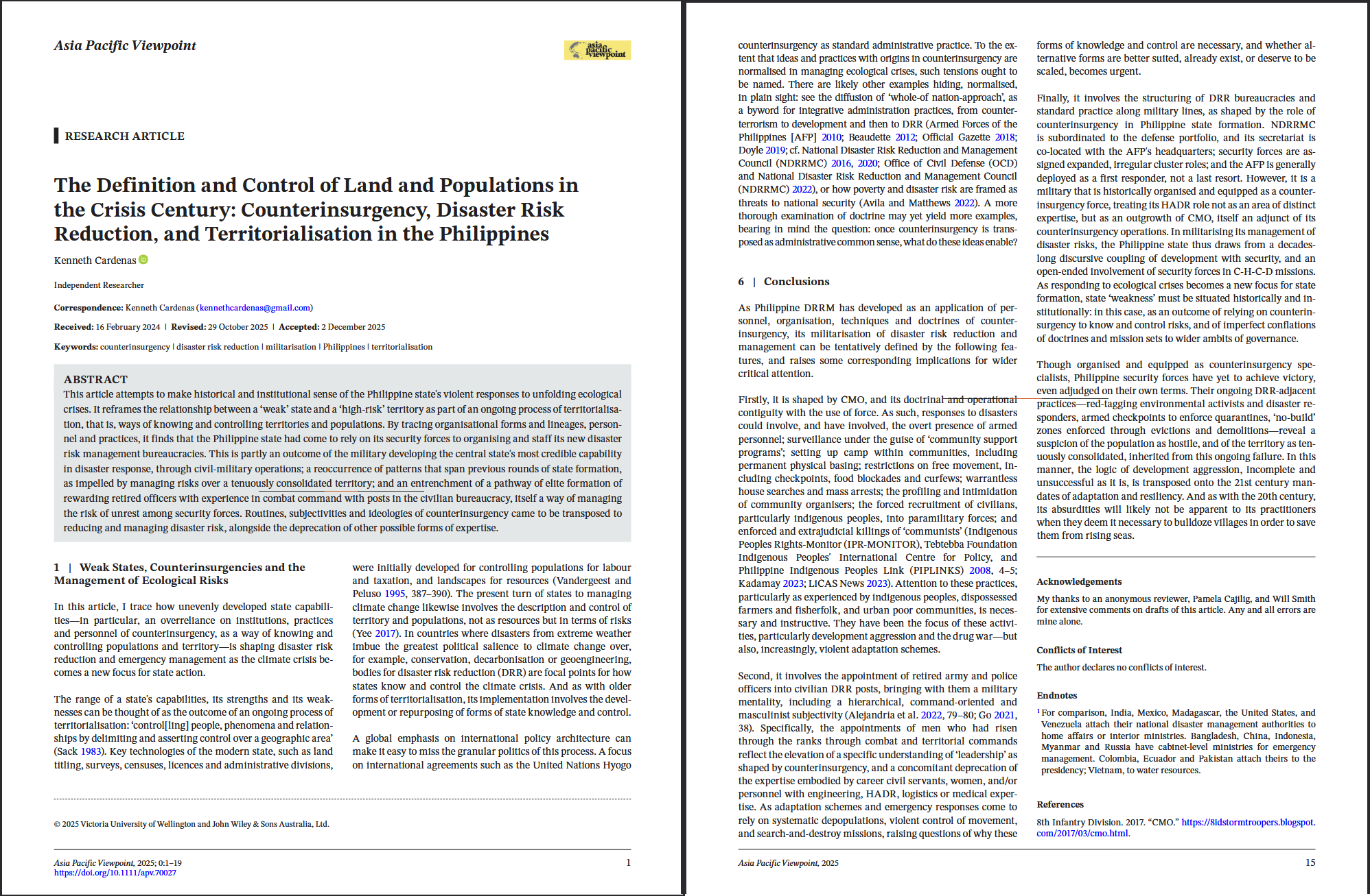 This article appears in a special issue of Asia Pacific Viewpoint on the theme More-than-complex: Governance and place in Philippine disaster management.